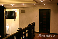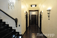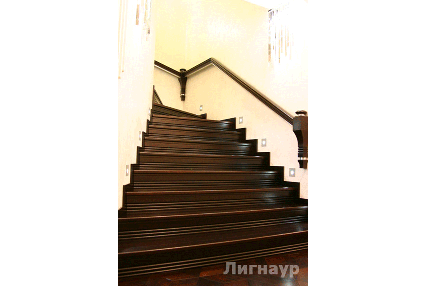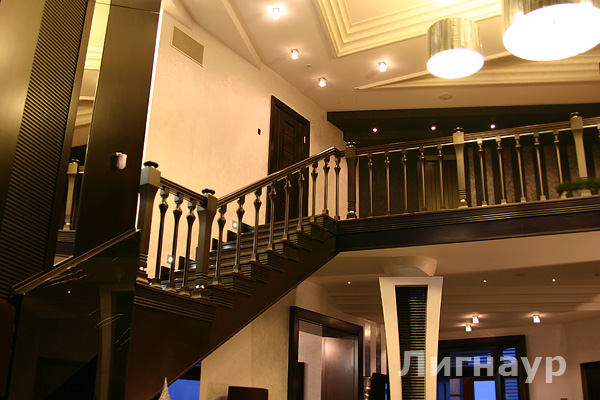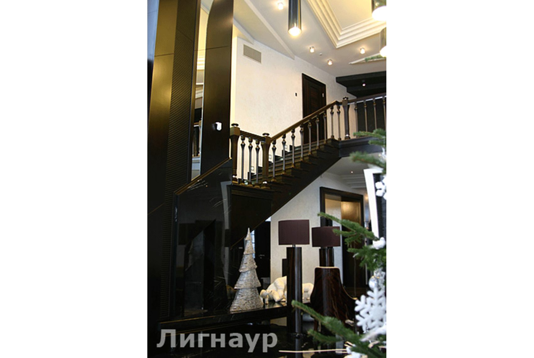 Лестница в стиле Ар деко с каннелированными вставками, поднимается от камина и переходит в балконное ограждение со стилизованными балясинами и столбами, декорированными серебром, очерчивая пространство гостиной. Двери и порталы из клена с фанеровкой эбеновым деревом. Дизайн интерьера Романа Петинцева.